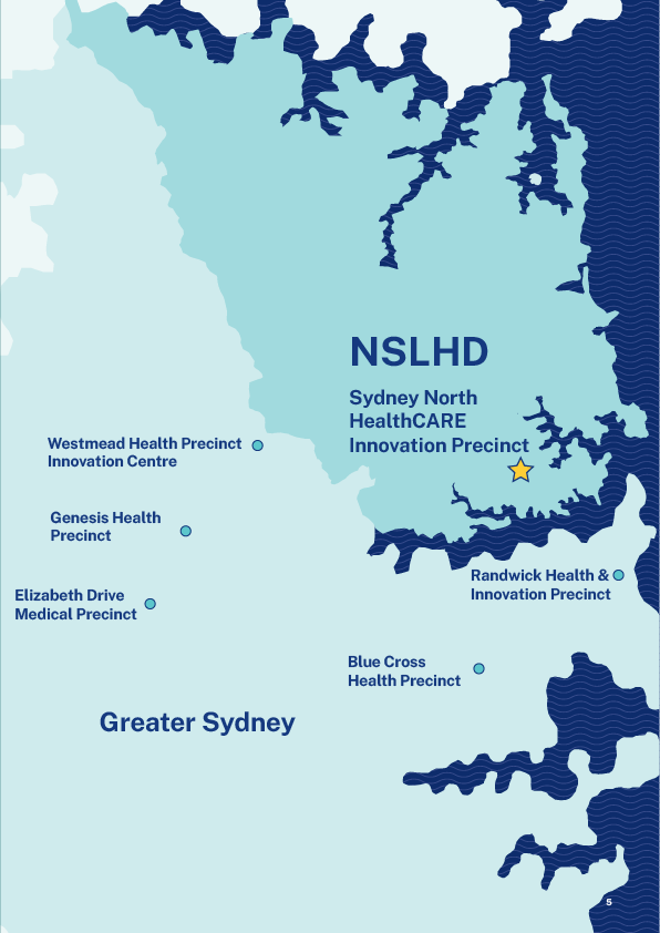 Sydney North HealthCARE Innovation Precinct is located in St Leonards, 8km from Sydney CBD, on the traditional country of the Cammeraygal peoples. Transport links include co-location with St Leonards train station, 600m from Crows Nest Metro, adjacent to NSW Ministry of Health headquarters, and 15km from Macquarie Park Innovation District.